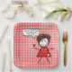 Chica de garrote con vino tinto en vidrio, pelo, collar de perlas y cita con fondo de gingham rojo y blanco. El texto es editable.