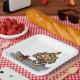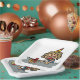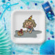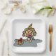 Un emocionado chica de cumpleaños usando un gorra fiesta y tiene un regalo. Este diseño parece realmente efectivo en estas placas de papel