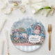 Platos de papel con una imagen vintage de un joven chica con adorables rizos sentados en un cochecito, jalados por dos corderos suaves. Decorado con cintas azules y flores. Un marco decorativo blanco recubierto por encima con el texto en su interior. Un patrón de rayas azules y blancas detrás. Perfecto para una ducha de bebé, cumpleaños de un niño o una ducha de novia.