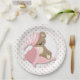 Estas adorables placas de papel para bebés cuentan con un lindo y somnoliento oso de peluche marrón con una gorra rayada rosa y blanca y mantas rosas. La imagen está enmarcada en un borde de polkadot rosa y marrón. No olvide ver los productos de ducha para bebés de nuestra tienda.