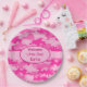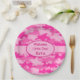 Bienvenidos a la niña pequeña con estos platos de papel fiesta, divertidos y elegantes, personalizados con su nombre con un diseño de camo rosa femenino. Las palabras "Bienvenida a la Pequeña" son personalizables y pueden cambiarse a otras palabras o ocasiones. Este camuflaje es un arte original en tonos rosas y fucsia. Un óvalo rosa claro en una tira rosada proporciona un área para personalizar con palabras o nombres. El diseño de este camo, muy coqueto y a la moda, es obra del artista y diseñador de tejidos Phyllis Dobbs y está disponible en otros colores en diferentes productos para sus ocasiones. ¡Diviértete con el camuflaje! Personalizable completo para la personalización.