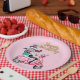 Un chica montando una moto rosa cargando muchos regalos. Texto de "Feliz Cumpleaños".
