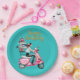 Un chica montando una moto rosa cargando muchos regalos. Texto de "Feliz Cumpleaños".