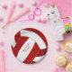 Los platos de papel de la fiesta de cumpleaños 7 de los chicas presentan un gráfico de voleibol rojo y blanco con el saludo de personalizable "Cumpleaños feliz" y el nombre del chica - los paneles rojos del voleibol se mezclan con un patrón kaleidoscópico floral de bonito, y los paneles de voleibol blanco se combinan con un patrón de rotación abstracto para una apariencia texturada que es artística y femenina - de katz._zynes