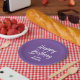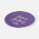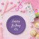 Platos de papel fiesta amables y divertidos para cualquier edad, con un fondo morado, un mensaje de cumpleaños feliz y espacio para agregar cualquier texto personalizado como un nombre o una edad.