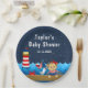 Este bonito y divertido plato cuenta con un mono marinero chica en una cubierta de madera con gaviota y cangrejo. Al fondo, un faro rojo y blanco, un bonito pájaro en un velero, olas del océano y un cielo estrellado azul marino. El texto combina fuentes audaces y serif para un estilo elegante y moderno. Es ideal para una ducha de natación con temática náutica.