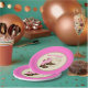 La placa de papel para la fiesta de cumpleaños de este niño presenta un tema occidental diseñado específicamente para un chica. El fondo es rosa brillante con un borde de cuerda y se acentúa con un par de botas de vaquera rosadas. El texto del estilo de la pista dice: Apuesta 'pero arranque!