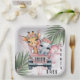 Dos animales animados: una jirafa y un elefante. Ambos están adornados con coronas florales en la cabeza. La jirafa, con su largo cuello y su patrón de manchas, se sienta en el lado izquierdo de la imagen, mientras que el elefante, con sus grandes orejas y su tronco, está a la derecha. Ambos están sentados dentro de un vehículo rosa, que parece ser un auto. El fondo está formado por unas hojas de palmera rosas y mullidas, lo que da un ambiente tropical o safari a la escena.