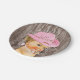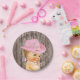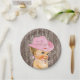Platos de papel para baby shower de vaquera con una adorable bebé vaquera que lleva un sombrero de vaquero rosa y un pañuelo rosa sobre un fondo de madera rústica. Puedes agregar texto para personalizar y mover a la bebé según sea necesario. También puedes eliminar el fondo de madera para agregar el color de fondo que desees.