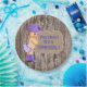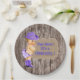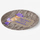 Platos de papel para baby shower de vaquera con adorable bebé vaquera con sombrero de vaquero morado y bandana morada con pancarta de arpillera sobre fondo de madera rústica. Puedes agregar texto para personalizar y mover al bebé según sea necesario. También puedes quitar la arpillera y el fondo de madera para agregar el color de fondo que desees.