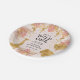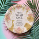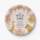 Estos platos de papel para fiestas de primer cumpleaños con temática de "salvaje uno" de la jungla con safari tienen animales de Relieve metalizado de imitación dorados (jirafa, león y monos), follaje de jungla dorada y rosa, y una rociada de confeti de oro en un fondo rosa pálido. Agregue el nombre del chica de cumpleaños y otro texto en negro.