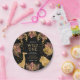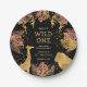 Estos platos de papel para fiestas de primer cumpleaños con temática de "salvaje uno" de la jungla con safari tienen animales de Relieve metalizado falsos de oro (jirafa, león y monos), follaje de jungla dorada y rosa, y una rociada de confeti de oro sobre un fondo negro. Agregue el nombre del chica de cumpleaños y otro texto en oro y blanco.