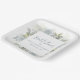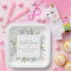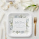 Este diseño de servilleta de cóctel o cena de papel presenta flores azules polvorientas florales botánicas, un elegante follaje de vegetación para ducha de novia, un bosque de follaje de hoja floral, una tipografía minimalista simple, un texto de fuente de caligrafía moderna, un plato de papel cuadrado de postre o cena elegante y moderno, un ramo de jardín romántico de acuarela suave, un verde plateado azul pálido claro, una elegancia simple chic floral bonita, un hermoso verano otoño primavera invierno
