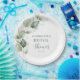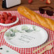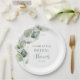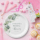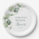 Plato de papel temático botánico moderno y trendy para ducha de novia con eucalipto en fondo blanco.