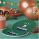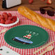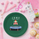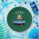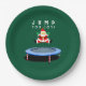 Creative Christmas holiday party plates featuring funny Santa Claus jumping on trampoline.
