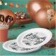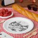 These elegant black-and-white Christmas plates feature a beautifully illustrated winter village, evoking the quiet charm of a storybook scene. Delicate linework captures snow-covered rooftops, pine trees, and a winding stream beneath a stone bridge, all bathed in a soft, vintage glow. A slender church steeple watches over cozy cottages, while distant mountains fade into a dreamy horizon. The design is airy and serene, inviting warmth and nostalgia. At the right of the illustration, you can personalize the “Merry Christmas” message.