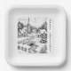 These elegant black-and-white Christmas plates feature a beautifully illustrated winter village, evoking the quiet charm of a storybook scene. Delicate linework captures snow-covered rooftops, pine trees, and a winding stream beneath a stone bridge, all bathed in a soft, vintage glow. A slender church steeple watches over cozy cottages, while distant mountains fade into a dreamy horizon. The design is airy and serene, inviting warmth and nostalgia. At the right of the illustration, you can personalize the “Merry Christmas” message.
