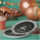 Abraza el espíritu de la temporada y comparte sentimientos cálidos con nuestros exquisitos platos de papel para fiestas con estampado de cuadros negros y blancos y ciervo plateado de Feliz Navidad. Este diseño moderno muestra hermosamente el saludo navideño "NAVIDAD ALLEGRE Y BRILLANTE". El diseño festivo incluye divertidos renos ciervos plateados, todo sobre un fondo negro que se transita suavemente para mejorar la tipografía en general.