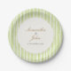 Round paper plates with green stripes, central customizable couple's names and date in elegant gold script, ideal for dessert, cake, or luncheon service. Matches striped napkins, seating charts, and stationery for cohesive table settings.