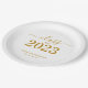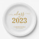 Elegante y elegante oferta de fiesta de graduación de personalizado. Celebra el logro del graduado con estilo con este moderno plato de papel de graduación. Funciones de diseño "Clase de 2023" en fuentes doradas sobre un fondo blanco limpio. Personalice este producto agregando el nombre y el nombre de la escuela. Fácil de personalizar. Se dispone de material para fiestas de graduación coincidente. ¡Enhorabuena!