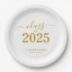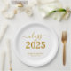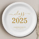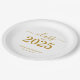 Elegante y elegante oferta de fiesta de graduación de personalizado. Celebra el logro del graduado con estilo con este moderno plato de papel de graduación. Funciones de diseño "Clase de 2025" en fuente dorada sobre un fondo blanco limpio. Personalice este producto agregando el nombre y el nombre de la escuela. Fácil de personalizar. Se dispone de material para fiestas de graduación coincidente. ¡Enhorabuena!