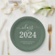 Elegante y elegante oferta de fiesta de graduación de personalizado. Celebra el logro del graduado con estilo con este moderno plato de papel de la fiesta de graduación. El diseño presenta "Clase de 2024" con un elegante tipo de letra blanco sobre un hermoso fondo verde sabio. Personalice este producto agregando el nombre y el nombre de la escuela. Fácil de personalizar. Se dispone de material para fiestas de graduación coincidente. ¡Enhorabuena!