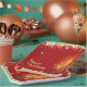 Este plato de papel de Navidades Clásicos cuenta con un magnífico ilustracion de Navidades con velas rojas y doradas, adornos y copos de nieve dorados y un texto de "Feliz Navidad", con un vibrante fondo rojo.