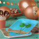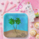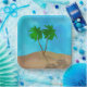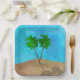 Placa de papel en una escena de palmeras tropicales, arena y cielo hecha de un collage digital de acuarelas e imágenes con motivos