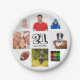 Un plato de papel para una fiesta de cumpleaños número 21 (o cualquier edad) celebrando su vida con un collage de ocho de tus fotos. Personaliza y agrega edad a 21 años y fecha. Fecha de nacimiento o fecha del fiesta. Letras de color negro. Fondo blanco.
