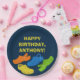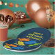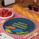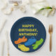 Throw a fun party for kids or adults with these personalized paper plates. These custom party supplies feature illustrations of plastic moccasin or clogs style shoes in bright colors. Lime green, bright blue, yellow and orange shoes are set against a navy blue background. Your message is spelled out in bold yellow lettering.