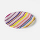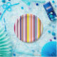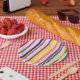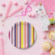 Platos de papel amarillo, rosa, púrpura, azul, verde, blanco, vertical, con rayas de humor de verano.