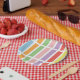 Patrón geométrico lineal, rectangular, rayado de tonos pastel arcoiris de azul, naranja, verde, rosa, púrpura, rojo y amarillo.