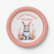 Un pequeño conejo dulce rodeado de flores rosas y coralinas color agua ilustracion de cumpleaños personalizado platos de papel para una niña.