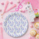 Felices placas de papel de Pascua y servilletas de papel a juego con conejillos azules y morados.