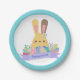 Platos de papel cortos con el conejo de Pascua sentado entre un montón de huevos coloridos.