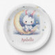Un plato de papel superlindo con un lindo conejito blanco vestido con un hermoso arco morado sentado en una luna amarilla con algunas estrellas doradas cayendo.