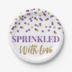 Espolvoreada con platos de leche de bebé de amor rociados en forma de confetti morado y dorado.