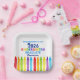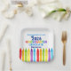 This adorable 2026 kindergarten graduation party paper plate features a cool grad cap above colorful writing and a row of crayons in rainbow. Cute customizable kindergartener graduate decor in fun colors for the last day of elementary school with your kid's name personalized in blue. Congratulations to our kinder grad!