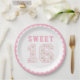 Este dulce plato de 16 papel presenta el número 16 en un patrón de rosa de cabaña rosado con dulce en un tipo de letra de variación rosa. Hay un borde de vieiras alrededor del borde.