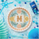 These monogram paper plates have a vintage Mexican talavera tile design.