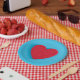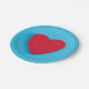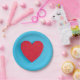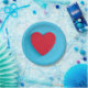 Este diseño presenta una imagen de un corazón rojo brillante que originalmente estaba hecho de fieltro; está colocado sobre un fondo azul claro.