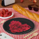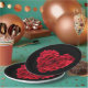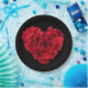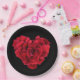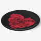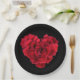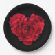 Rosa rojo hermoso y pétalos color de rosa dispuestos en la forma de un corazón que se opone hacia fuera a un fondo negro en las placas de papel del fiesta.