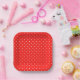 Platos de fiesta de papel con diminutos patrones de corazón blanco sobre fondo rojo brillante. No deje de ver el resto de los corazones pequeños y la colección de papel de colores audaces.