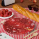 Efecto bokeh y corazones en un rojo profundo y brillante.