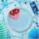 Un gran corazón rosado con dos corazoncitos rojos unidos en el interior. El fondo es una textura abstracta azul claro con toques de amarillo y verde. El fondo está decorado con pequeños corazones blancos desvanecidos. Personaliza con las iniciales de las parejas en corazones rojos sentados juntos.