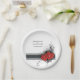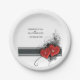 Un romántico plato de papel boda. Dos corazones con la inicial de la novia y el novio. Los elegantes rollos y las flores dan un respaldo a los corazones. Este aspecto irá bien en cualquier estación boda, primavera, verano, otoño o invierno. Ideal para un boda moderno y perfecto para un boda clásico.