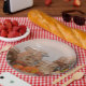 Estos platos de papel presentan una cosecha de verano en una vieja estufa de gas de época.
