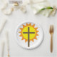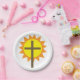 Una cruz contra un sol amarillo brillante. Este diseño se ve realmente efectivo en estas placas de papel