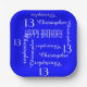 ELIJA SU COLOR y cree su propio elegante plato de papel personalizado para una fiesta de 13 años o cualquier otra ocasión. El nombre y la edad se repiten en blanco. Este estilo tiene un fondo azul brillante por defecto, pero puede seleccionar fácilmente un color de fondo diferente. ¡Eres el diseñador! Fácil de personalizar: simplemente CAMBIAR NOMBRE, EDAD y OCASIÓN EN UN SOLO LUGAR. Admite nombres de hasta 11 caracteres. Elija cuadrado o redondo. Un elegante, elegante y moderno plato de papel del Partido del Cumpleaños para un adolescente. Las servilletas coincidentes están disponibles en mi tienda de zazzle, SocolikCardShop. Todos los derechos reservados © 2015 Alan & Marcia Socolik.