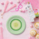 Este plato de papel presenta un ilustracion personalizado verde de una rebanada de pepino.